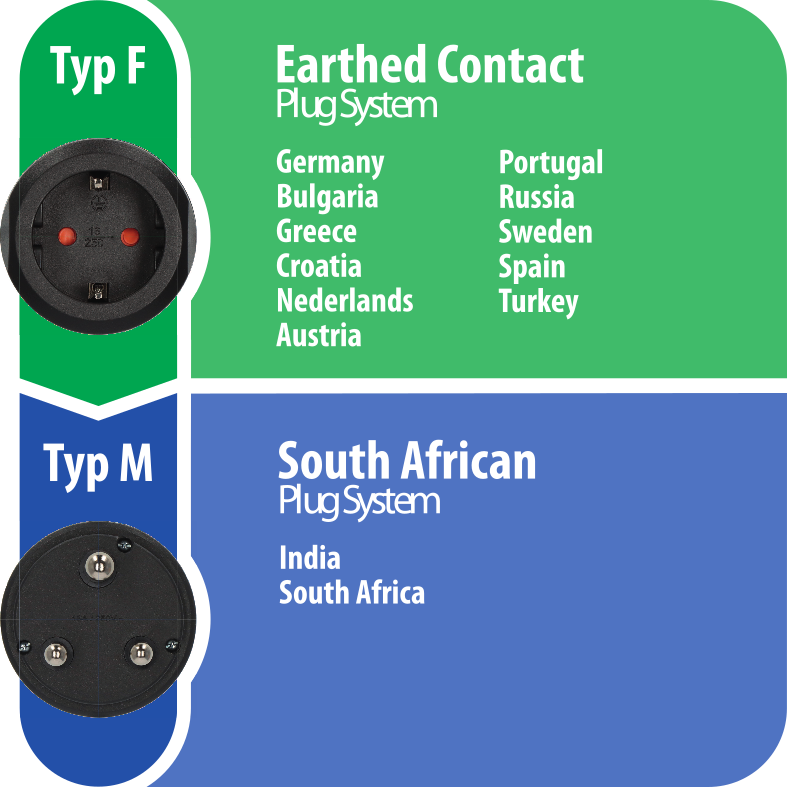 - Geeignet für Steckdosen mit dem Stecksystem "M" der Länder: Südafrika, Indien, ...