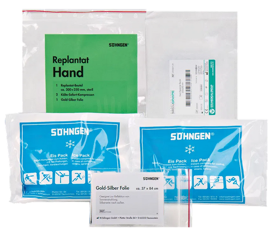 Replantat Beutel, um amputierte Glieder zu transportieren. Das Produkt funktioniert mit zwei ineinander liegenden Beuteln. Beide sind wiederverschließbar. Das Amputat wird in den Innenbeutel gelegt, wo es mittels Kälte-Sofort-Kompressen im Außenbeutel gekühlt werden kann.