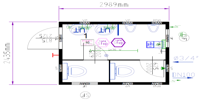 - 1 Druckreduzierventil inkl. Wasserfilter, rückspülbar Zu- und Ablauf im Paneel versenkt, Position und Dimensionen gem. Skizze
