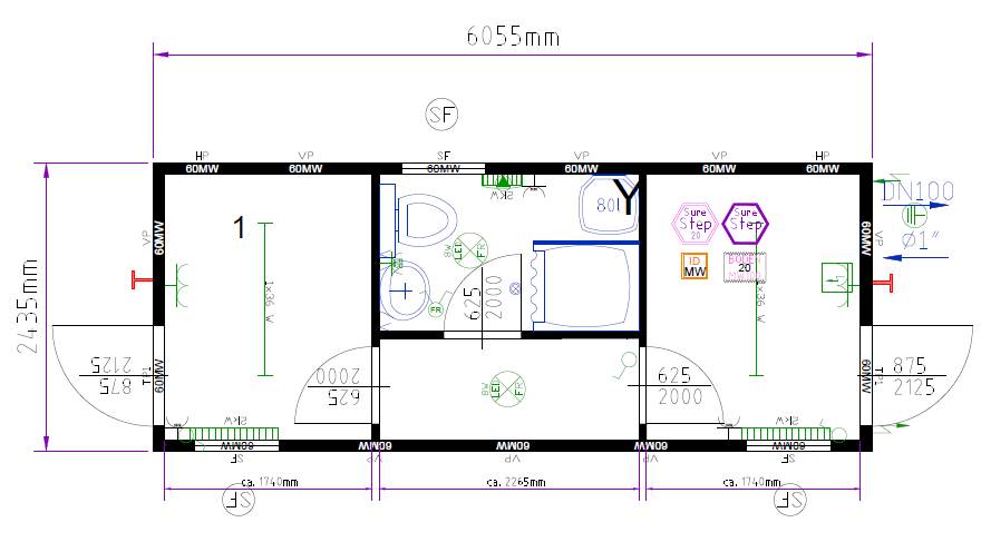 - Boden/Wand/Dach:100/60/100 mm Mineralwolle