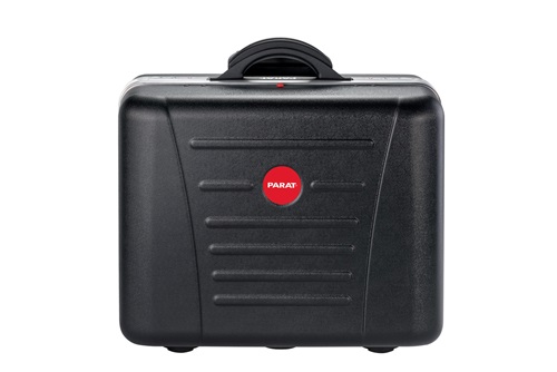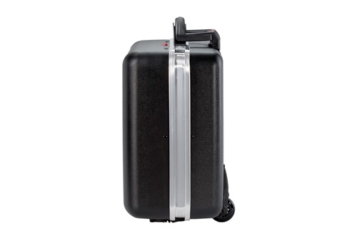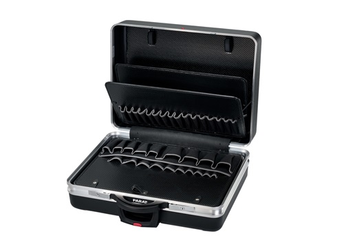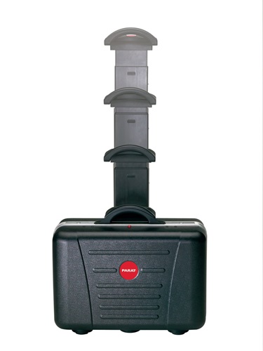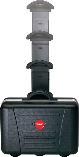 rollbar · Kofferschalen aus schlagfestem X-ABS-Kunststoff schwarz · Werkzeugtafeln aus Con-Pearl (hohe Beständigkeit gegen Feuchtigkeit, hohe Kratzfestigkeit) · Doppel-Aluminiumrahmen · Kippzylinderschlösser · Rasterscharniere · Bodengleiter · arretierbarer Deckelhalter · 4-fach-Teleskopauszug · gummierte gelagerte große Laufrollen · Tragfähigkeit bis 30 kg