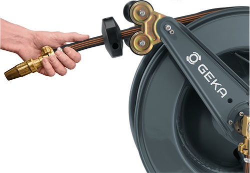 GEKA® plus Automatischer Schlauchaufroller · pulverbeschichtete Stahlkonstruktion · automatischer Rückzug des Schlauchs · für Wand-, Boden- und Deckenmontage · fertig montiert und sofort einsatzbereit · schwenkbare Wandhalterung separat erhältlich