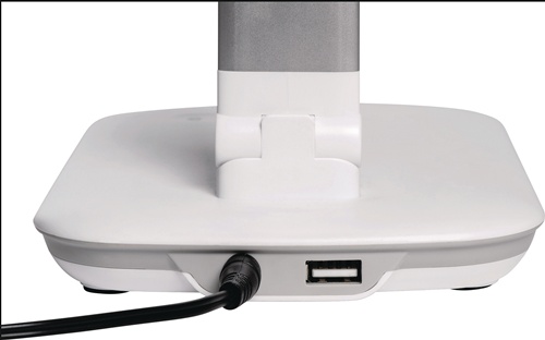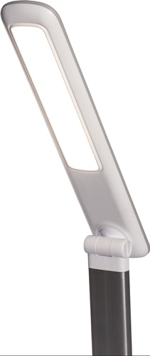 Aluminium/Kunststoff · mit Standfuß · mit integriertem 5V, max. 500 mA USB Typ A Anschluss zum Aufladen von z. B. Smartphones · 5-Stufen-Dimmer mit Touchfeld-Bedienung am Leuchtenfuß · Leuchtenkopf 265 x 50 mm – Armlänge 365 mm – Höhe 425 mm ∙ Betriebsspannung 220 - 240 V · Lichtfarbe 4.000 Kelvin - neutralweiß · Lebensdauer 50.000 Stunden · Lichtstrom 830 Lumen · gewichteter Energieverbrauch 5 kWh/1000 h · Energieeffizienzklasse C (Spektrum A bis G)