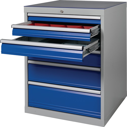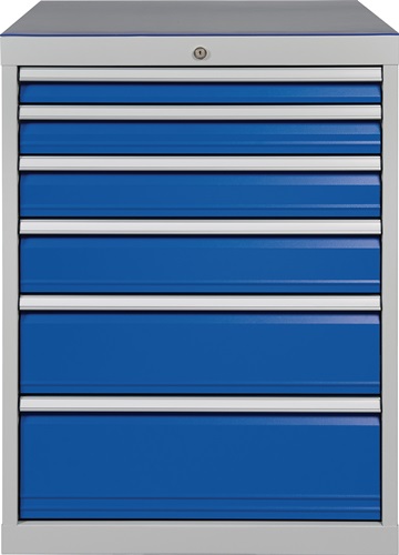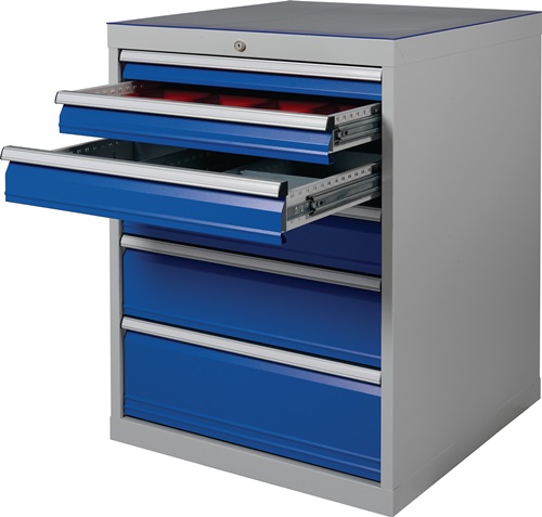 präzise Stahlblechkonstruktion mit robuster Pulverbeschichtung (Strukturlack) · Gesamttragfähigkeit 1500 kg · Schubladenführungen mit 100 % Vollauszug und absoluter Einzelauszugsperre mit Zentralverschluss · Aluminium-Griffleisten mit Beschriftungsstreifen und Klarsichtabdeckung · Innenmaße B 600 x T 600 mm · Tragfähigkeit pro Schublade 100 kg