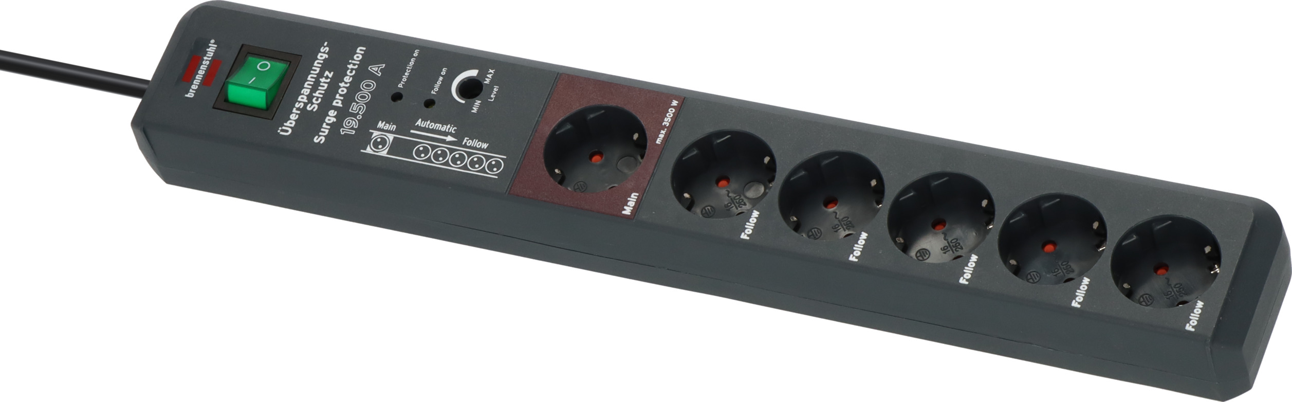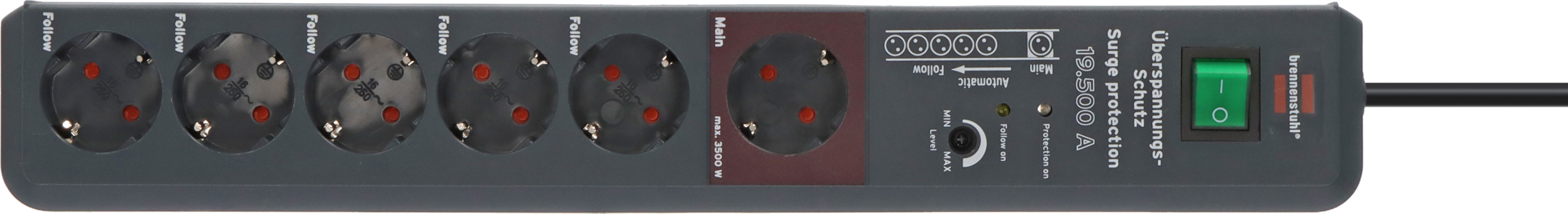 mit ein- und ausgeschaltet werdenHoher Komfort durch 1 Main (3500W) und 5 Follow-Steckdosen (3500W)Einstellbare Schaltschwelle (ca. 8 bis 80W)Je eine Funktionskontroll-Leuchte für Überspannungsschutz und Follow-SteckdosenSteckdosen mit erhöhtem Berührungsschutz in praktischer 45°-AnordnungGesamtleistung max. 16A/3500WExtra langes Kabel 3mNennstrom 16AZusätzliche Ausstattung 2 Permanent-SteckdosenStecksystem DETechnische Daten