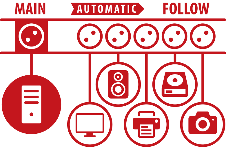 Die Master-Slave bzw. Main-Follow-Technologie ist das Automatik-Schaltsystem für Steckdosenleisten (1 Main + 4 Follow)Main-Follow