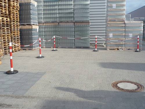 mit Sechseckfuß · Polypropylencarbonat · Pfosten Ø 63 x H 1000 mm · Fuß 370 x 75 mm · schnelle Verbindung des Fußes mit dem Pfosten durch Bajonettverschluss · Pfosten rot mit 2 weißen, reflektierenden Streifen · mit Öse am Pfostenkopf