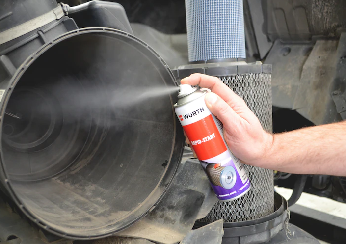 Während des Startvorgangs Start-Rapid kurz (max. 1–2 Sekunden) in den Ansaugstutzen des Luftfilters sprühen = Problemloser Sofortstart