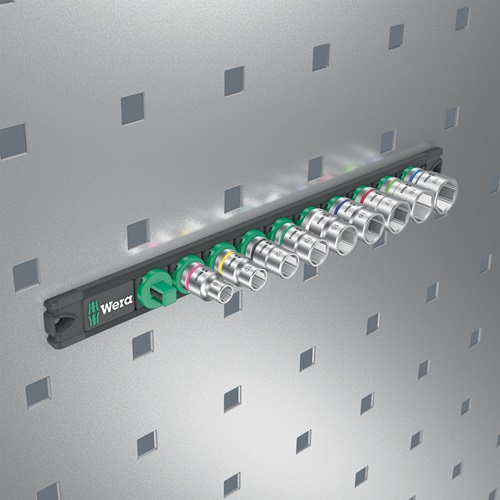 Nuss-Magnetleiste mit 9 Hand- und Maschinensteckschlüssel-Einsätzen (non-impact) · 3/8″. Ein leichtgängiger Drehmechanismus sorgt für einen sicheren Halt und leichte Entnahme der Nüsse. Mit Take it easy Werkzeugfinder mit Farbkennzeichnung nach Größen - zum einfachen und schnellen Finden des benötigten Werkzeugs. Die Magnetleiste ermöglicht die temporäre Anbringung an metallischen Oberflächen und verfügt dank der Twist to unlock Funktion über eine sichere Nussverriegelung und -entriegelung. Vorteile: 9-teiliger Nuss-Satz auf Nuss-Magnetleiste · 3/8″. Magnetleiste mit sicherer Nussaufnahme und dennoch einfacher Entnahme (Twist to unlock) zur temporären Befestigung an Wand · Regal oder Werkstattwagen. Leichtgängiger Drehmechanismus für sicheren Halt und leichte Entnahme der Werkzeuge. Mit Werkzeugfinder Take it easy: Farbkennzeichnung nach Größen. Für die Hand- und Maschinenbetätigung (non impact). Mit Kugelfangrille · Rändelung am hinteren Ende für hohe Griffigkeit. Nuss-Magnetleiste mit 9 Hand- und Maschinensteckschlüssel-Einsätzen (non-impact) · 3/8″. Ein leichtgängiger Drehmechanismus sorgt für einen sicheren Halt und leichte Entnahme der Nüsse. Mit Take it easy Werkzeugfinder mit Farbkennzeichnung nach Größen - zum einfachen und schnellen Finden des benötigten Werkzeugs. Die Magnetleiste ermöglicht die temporäre Anbringung an metallischen Oberflächen und verfügt dank der Twist to unlock Funktion über eine sichere Nussverriegelung und -entriegelung.