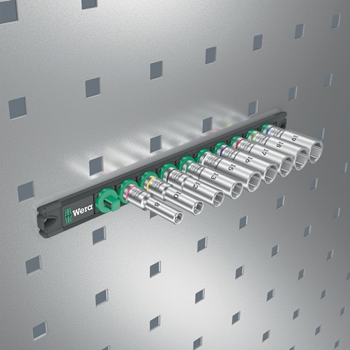Nuss-Magnetleiste mit 9 langen Hand- und Maschinensteckschlüssel-Einsätzen (non-impact) · 3/8″. Ein leichtgängiger Drehmechanismus sorgt für einen sicheren Halt und leichte Entnahme der Nüsse. Lange 3/8″ Hand- und Maschinensteckschlüssel-Einsätze (ISO 2725-Teil 3) von Wera für den Einsatz im Hand- und Maschinenbetrieb (non impact) auch bei tiefliegenden Verschraubungen und überstehenden Gewindestangen. Mit Take it easy Werkzeugfinder mit Farbkennzeichnung nach Größen - zum einfachen und schnellen Finden des benötigten Werkzeugs. Griffig zum leichten Greifen auch mit öligen Händen. Mit Sechskantprofil und Kugelfangrille. Das Sechskantprofil ermöglicht die Übertragung hoher Kräfte und belastet die Kanten der Schraubenmutter bzw. des Schraubenkopfes weniger als ein Zwölfkantprofil. Feinverzahnte Knarren machen darüber hinaus durch ihren kleinen Rückschwenkwinkel den Einsatz eines Zwölfkantprofils auch in beengten Raumverhältnissen überflüssig. Für Außensechskantschrauben und -muttern. Die Magnetleiste ermöglicht die temporäre Anbringung an metallischen Oberflächen und verfügt dank der Twist to unlock Funktion über eine sichere Nussverriegelung und -entriegelung.