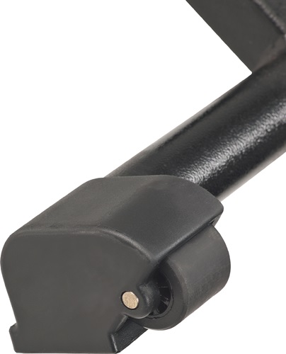 besonders robuste Stahlkonstruktion, pulverbeschichtet tiefschwarz, RAL 9005, Tragfähigkeit max. 250 kg · mechanische Höhenverstellung per Handrad · großer Sitz und Rückenlehne aus gepolstertem Kunstleder, leicht abwaschbar · Rückenlehne pendelnd gelagert, höhenverstellbar · platzsparend zusammenklappbar · mit Bodengleitern · kleine Rollen für einfachen Transport