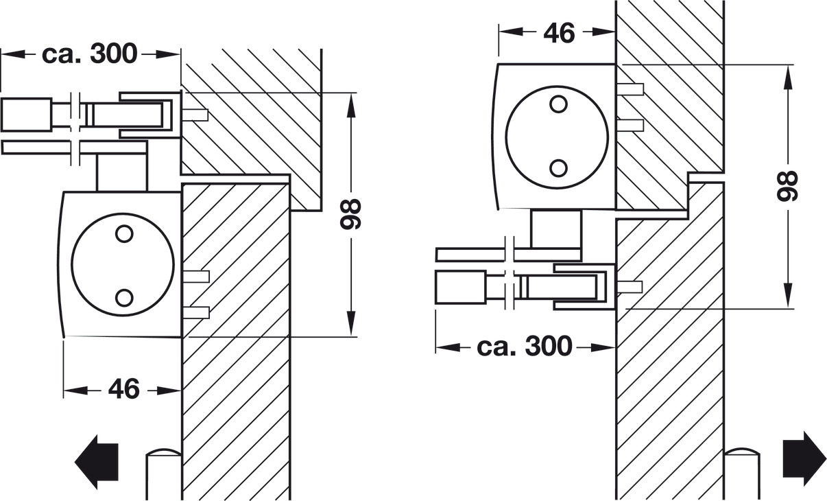 - Montageart: Normalmontage (Türblattmontage) auf der Bandseite, Kopfmontage (Sturzmontage) auf der Bandseite und Bandgegenseite