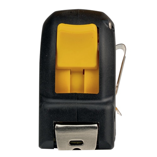 Stahlband gelb lackiert · automatischer Bandrücklauf und Bremsknopf · mm-Teilung · mit Gürtelclip · Öse zum Anbringen einer Handschlaufe · integrierte Nagel-Öse im Haken · Gehäuse aus ABS-Kunststoff