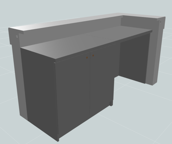 Dieses Thekenelement kombiniert moderne Optik mit praktischer Funktionalität und ist perfekt für Empfangsbereiche, Verkaufsräume oder gastronomische Anwendungen geeignet. Die großzügigen Frontflächen aus glasähnlichen Paneelen (türkis dargestellt) sorgen für einen frischen, offenen Look und setzen klare Akzente im Raum. Das massive Oberteil verleiht der Theke Stabilität, während die vertikalen Stützen in Kontrastfarbe Struktur und Halt bieten.