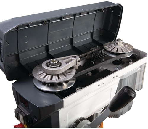 separater Not-Halt-Schlagschalter · Bohrtiefenanschlag · Bohrtisch ± 45° neigbar und 360° drehbar · aus einem Stück gegossener Aluminium-Druckguss-Pinolenhebel mit Softgrip-Griffen · Bohrtisch mit diagonal verlaufenden T-Nuten und umlaufender Kühlwasserrinne · Sicherheitselektrik in 24 V Gleichspannung