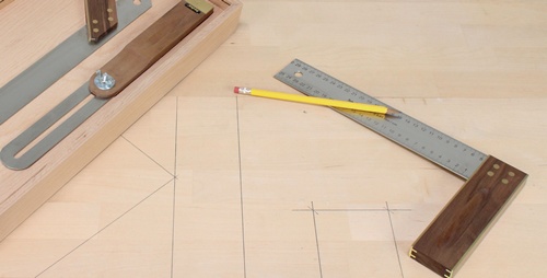 im Holzkasten · bestehend aus Tischlerwinkel, Gehrmaß und Schmiege · Zunge aus rostfreiem Edelstahl · geätzte, abriebfeste Millimeterskala auf beiden Seiten der Stahlzunge · mit Messingbeschlag · mit Anschlag · Abnehmen und Übertragen von Winkeln · Genauigkeit des 45°-Winkels 0,06° · Genauigkeit des 90°-Winkels 0,06°