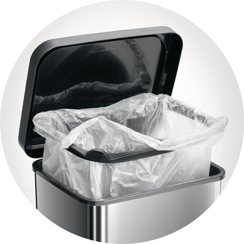 robusten Konstruktion aus flexiblen Kunststoffen · edler Metallic-Look · Dämpfer für sanftes und geräuschloses Schließen · Pedal für einfaches Öffnen · mit Gummifüße für ein festen Stand