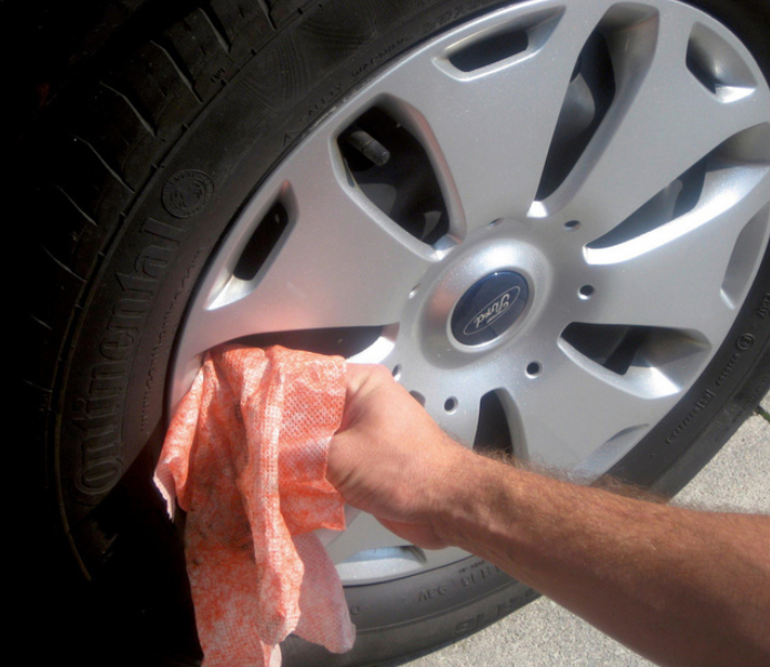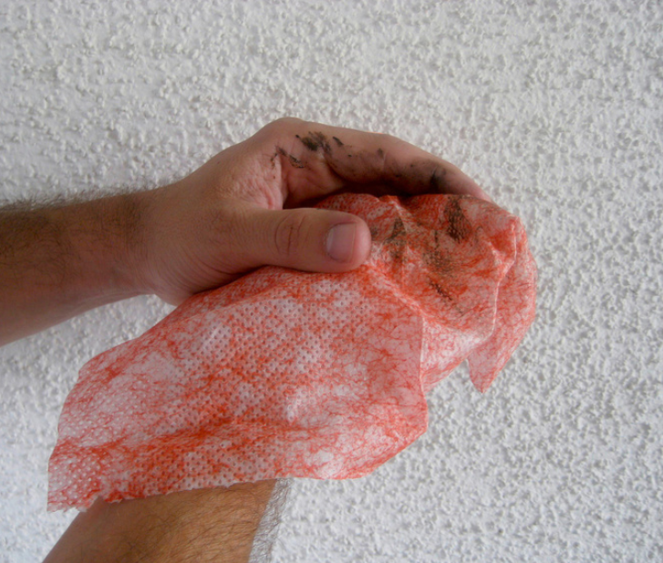 Feuchtes Tuch aus dem wiederverschließbaren Eimer ziehen, Verschmutzungen durch einfaches Reiben ablösen.