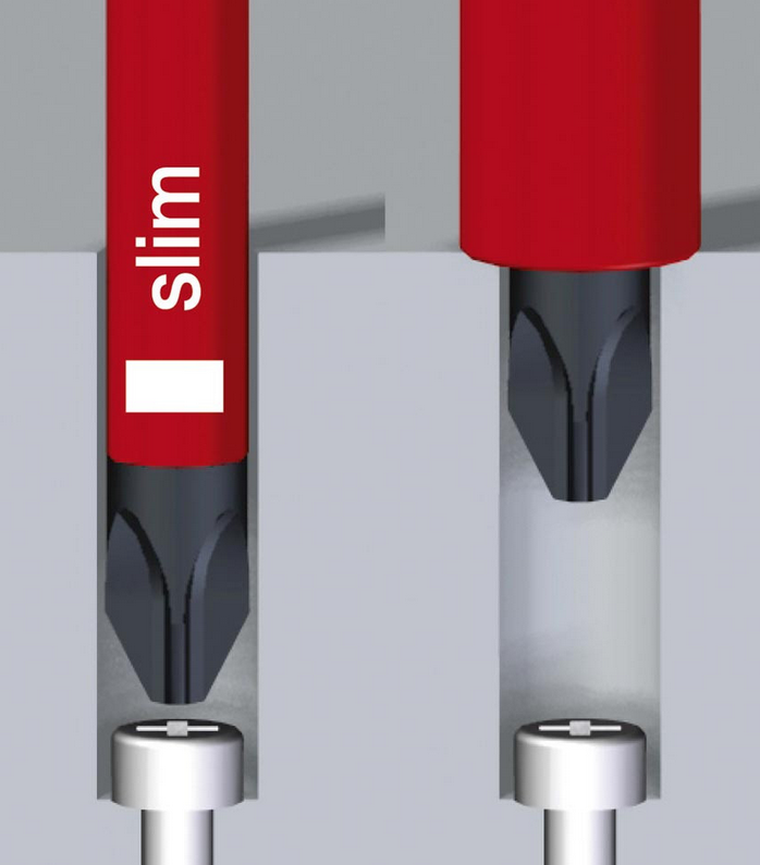 Ausführung: Schutzisoliert nach IEC 60900:2004 bis 1000 V, stückgeprüft Isolation direkt auf die Klinge gespritzt "slimFix"-Technologie zum Erreichen tiefliegender Schraub- und Federkernelemente Klinge aus Chrom-Vanadium-Molybdän-Stahl, durchgehend gehärtet, brüniert Ergonomischer "SoftFinish-Mehrkomponenten-Griff mit Abrollschutz VDE-/GS-geprüft