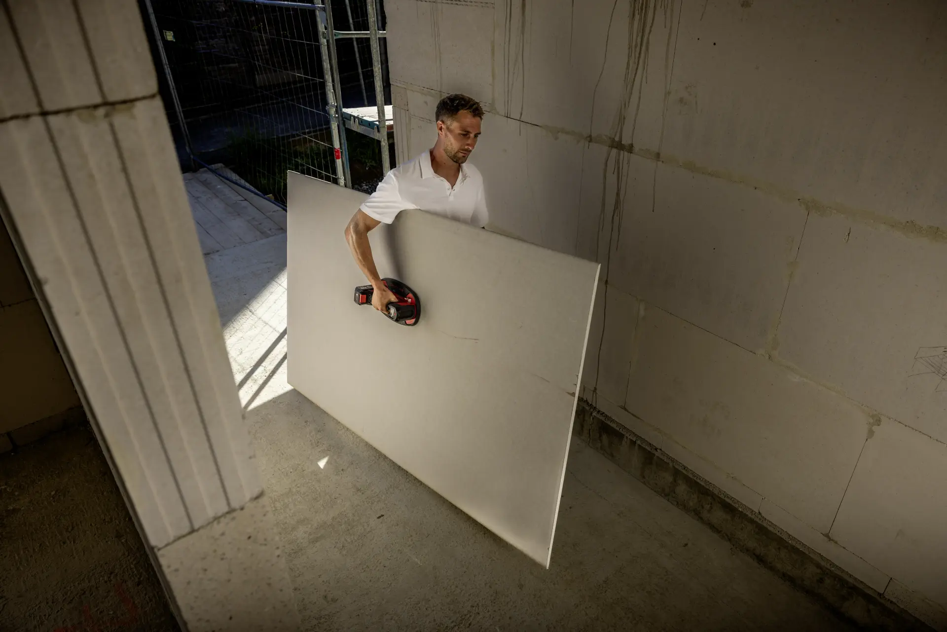 - Der Vakuumheber verfügt über eine von den Umgebungsbedingungen abhängige Haltekraft von bis zu 170 kg und saugt sich auf fast jeder Oberfläche an, sogar an staubigen, rauen oder halbporösen Materialien. Die zulässige Tragfähigkeit beträgt 130 kg.