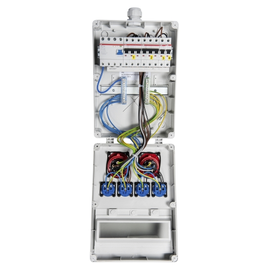 Die kompakte Stromverteilung zur festen Wandmontage ist komplett montiert und anschlussfertig verdrahtet – ideal für den professionellen Einsatz.