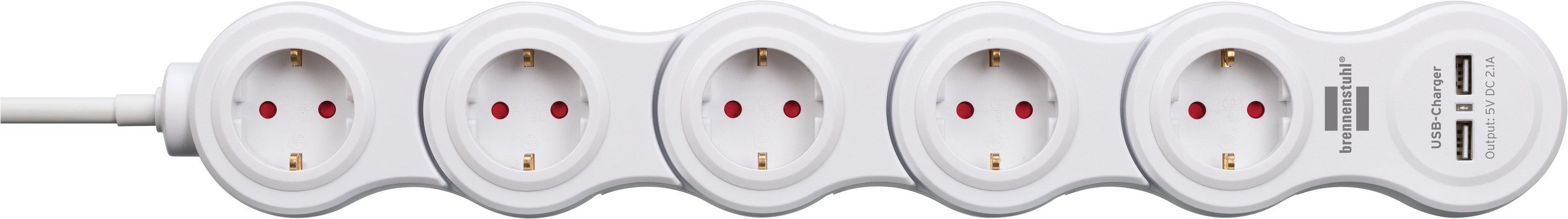 Flexible Steckdosenleiste 5-fach mit 2 USB Ladebuchsen, 1,4m Kabellänge (H05VV-F3G1,5) und erhöhtem Berührungsschutz