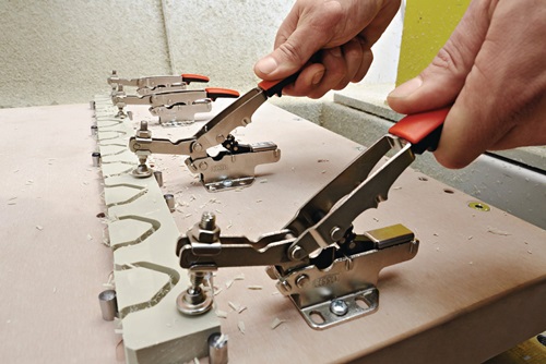 automatische stufenlose Anpassung der Spannhöhe bis 35 mm bei annähernd gleicher Spannkraft · regulierbare Spannkraft durch Einstellung der Stellschraube im Gelenk · abnehmbare Schutzkappe an der Druckplatte · Lochmuster der Grundplatte für mm und inch passend · 2-Komponenten Kunststoffgriff