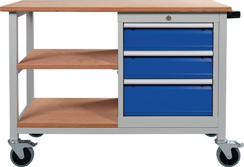 fahrbar · robuste Stahlblechkonstruktion pulverbeschichtet · Buche-Multiplexplatte 25 mm · Schubladen mit 100 % Vollauszug, Tragfähigkeit 50 kg · Schubladen-Innenmaße B 450 x T 400 mm · innen liegende Aluminium-Griffleisten mit Beschriftungsstreifen · Einzelauszugssperre und Zentralverschluss · 4 Lenkrollen Ø 125 mm, davon 2 mit Feststeller · Schiebegriff · Gesamttragfähigkeit 400 kg