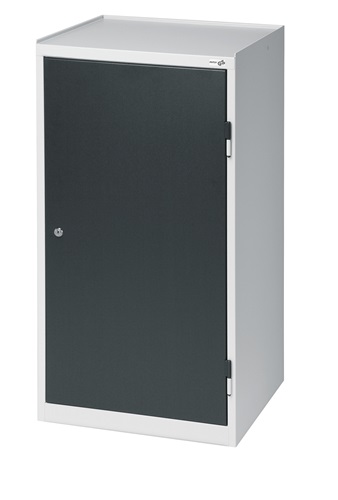 Stahlblechkonstruktion mit widerstandsfähiger Pulverbeschichtung · ausgestattet mit Schubladen und herausziehbaren Fachböden, mit allseitigem Rand, Höhe 30 mm, auf kugelgelagerten Präzisionsauszügen, 100 % ausziehbar · Schubladen, H 100 mm und Fachböden im 25-mm-Raster höhenverstellbar · Tragfähigkeit pro Fachboden/Schublade 35 kg · obere Ablage mit Abrollrand · Flügeltür abschließbar mit Zylinderschloss und Drehriegelverschluss mit 3-Punkt-Verriegelung
