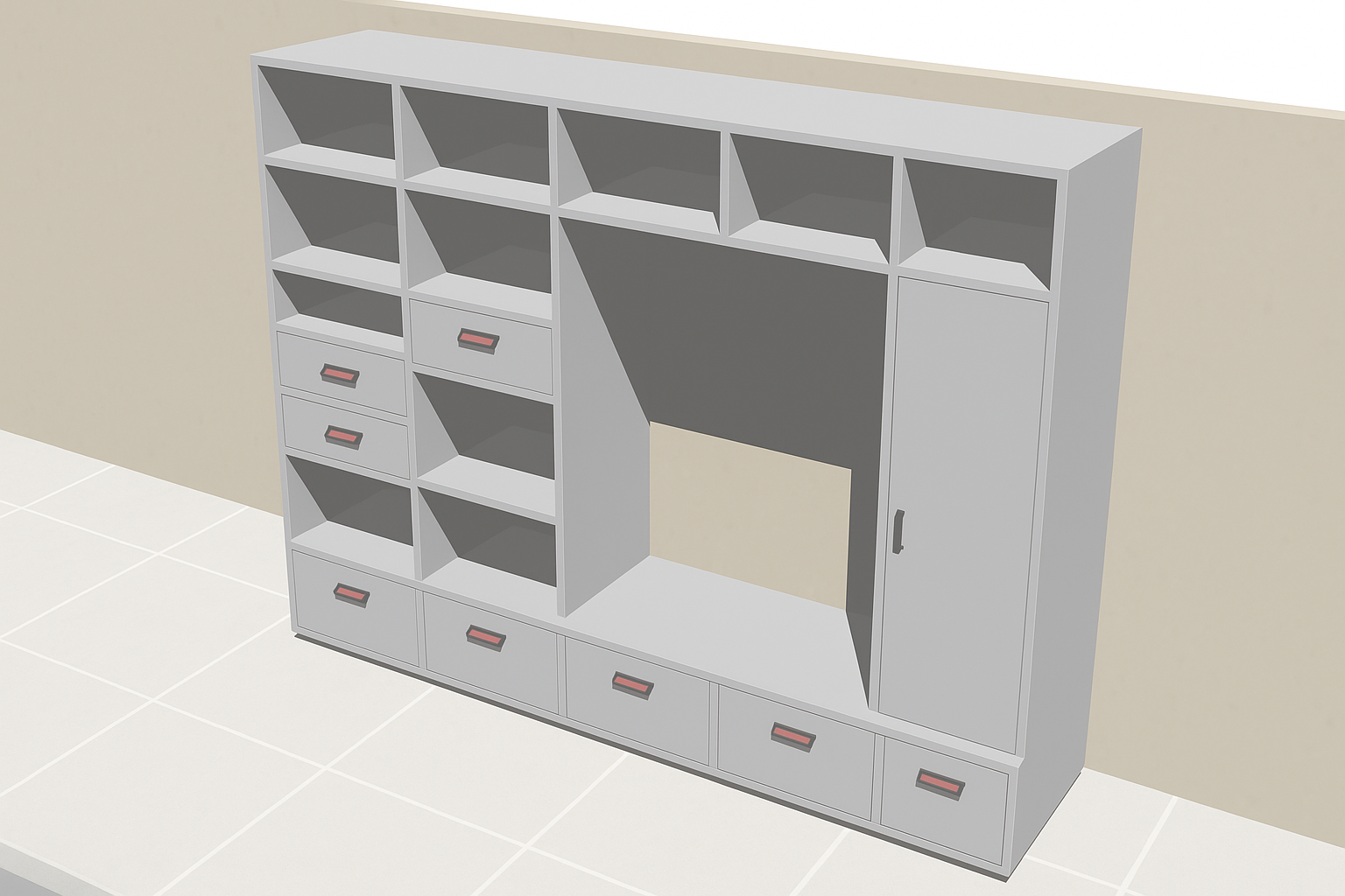 Diese maßgefertigte Wohnwand Typ VF besitzt eine vielseitige Stauraumlösung durch handwerkliche Präzision. In hochwertiger Stollenbauweise gefertigt, kombiniert er offene Ablageflächen, praktische Schubladen und ein geschlossenes Schrankelement.