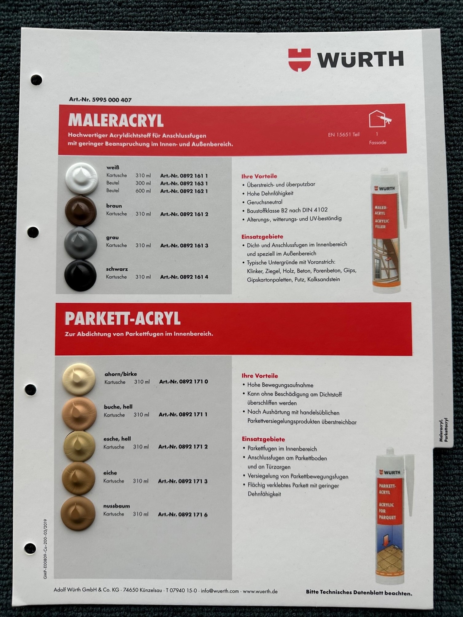 ...spezieller Acryldichtstoff von Würth für Fugen im Innen- und Außenbereich.Anwendung: Innen und AußenbereichGeruchlos (Basis Polyacryldispersion)Farbe: WeißInhalt: 310 mlGebinde: KartuscheChemische Basis: PolyacryldispersionHautbildezeit: 10 minNach vollständiger Durchtrocknung Überstreichbar