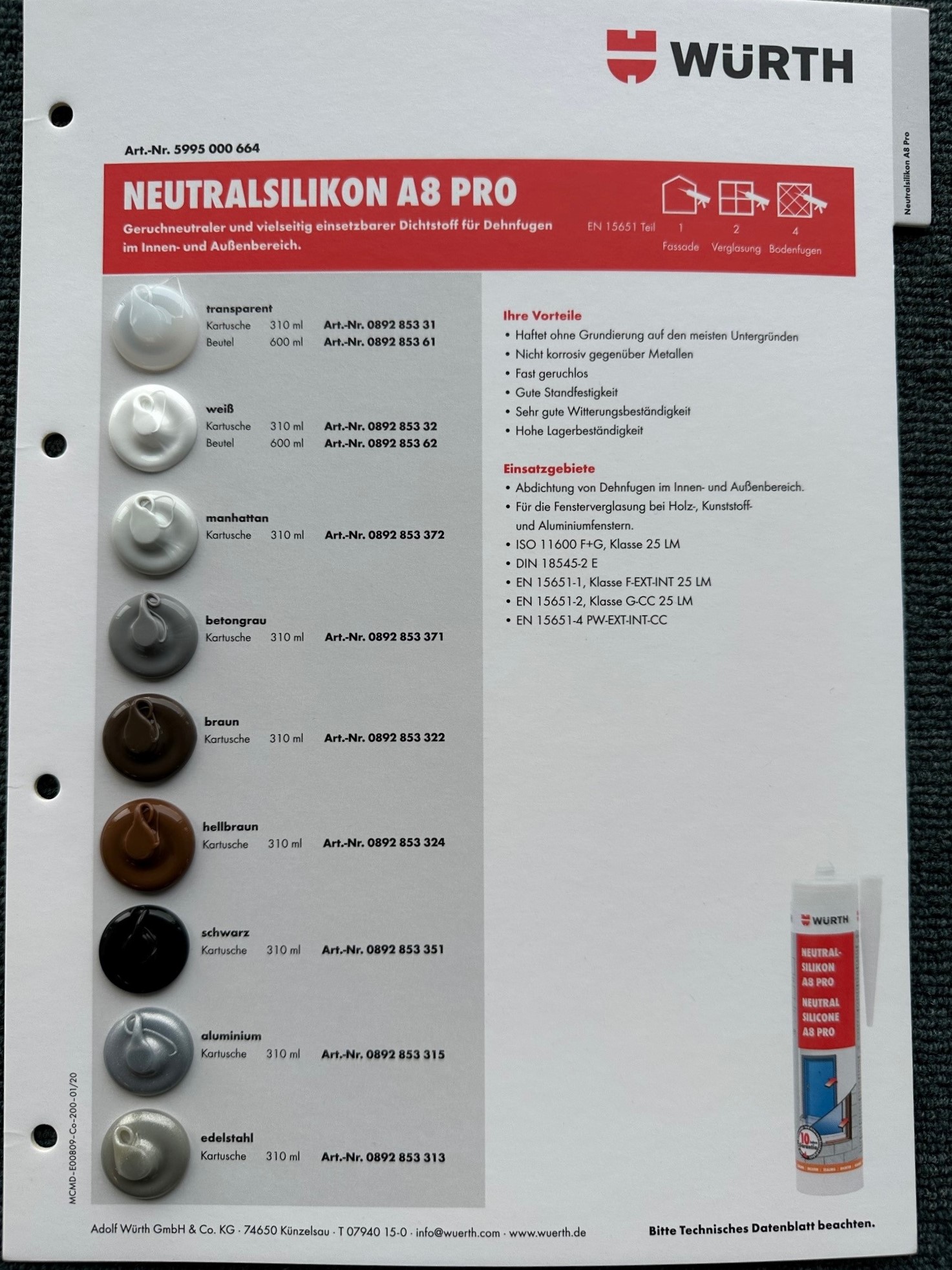 Sicherheitsdatenblatt "Würth Neutralsilikon A8 PRO | 310 ml | grau"