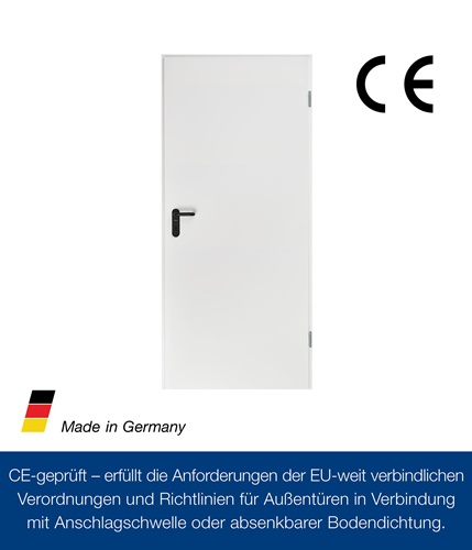 Türblatt 3-seitig gefälzt (Dickfalz), 40 mm dick · Blechdicke 0,8 mm · mit Styroporeinlage · Einsteckschloss mit Stahlfalle · vorgerichtet für Kurzschild · U-Profil im unteren Bereich · mit Bändern der Serie V0026 WF, verzinkt · 1 x Sicherungsbolzen (799 mm ab Türkasten) · Eckzarge B1 · mit Bändern V1000-01 WF, verzinkt · ohne Bodeneinstand · mit Durchschraubmontage durch den Nutgrund (inklusive Dübelanker) · inklusive Dichtung · Drückergarnitur Kunststoff schwarz · Element verpackt in Schrumpffolie