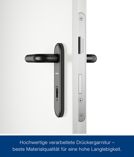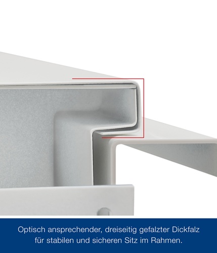 Türblatt 3-seitig gefälzt (Dickfalz), 40 mm dick · Blechdicke 0,8 mm · mit Styroporeinlage · Einsteckschloss mit Stahlfalle · vorgerichtet für Kurzschild · U-Profil im unteren Bereich · mit Bändern der Serie V0026 WF, verzinkt · 1 x Sicherungsbolzen (799 mm ab Türkasten) · Eckzarge B1 · mit Bändern V1000-01 WF, verzinkt · ohne Bodeneinstand · mit Durchschraubmontage durch den Nutgrund (inklusive Dübelanker) · inklusive Dichtung · Drückergarnitur Kunststoff schwarz · Element verpackt in Schrumpffolie