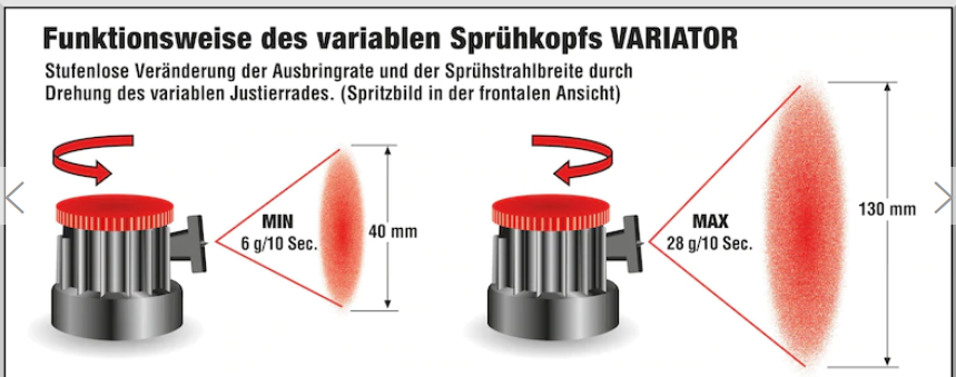 - Großflächige und kleine Ausbesserungen können durch den variablen Sprühkopf schnell und sicher ausgeführt werden.
