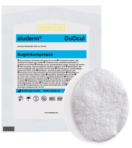 Wundversorgung und Polsterung von Augenverletzungen. Zwei oval geformte Augenkompressen, zusammen steril in Peelpackung, jeweils eine Kompresse aluderm® und eine Kompresse DermaCare®.