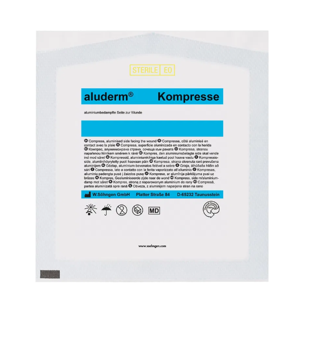 ... Aluminiumbedampfte Wundauflage mit starker Sauglage zur Versorgung oberflächlicher Wunden, wie Schürfwunden, Verbrennungen oder Schnittwunden.
