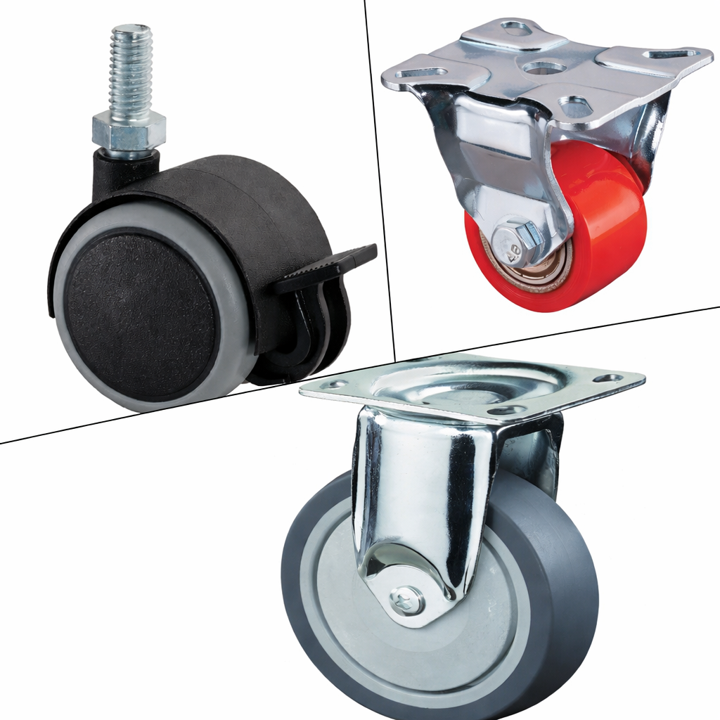Rollen mit Anschraubplatte eignen sich für viele Transportwagen und Geräte. Rollen mit Gewindestift werden häufig bei Möbeln, Regalen oder leichten Konstruktionen verwendet.